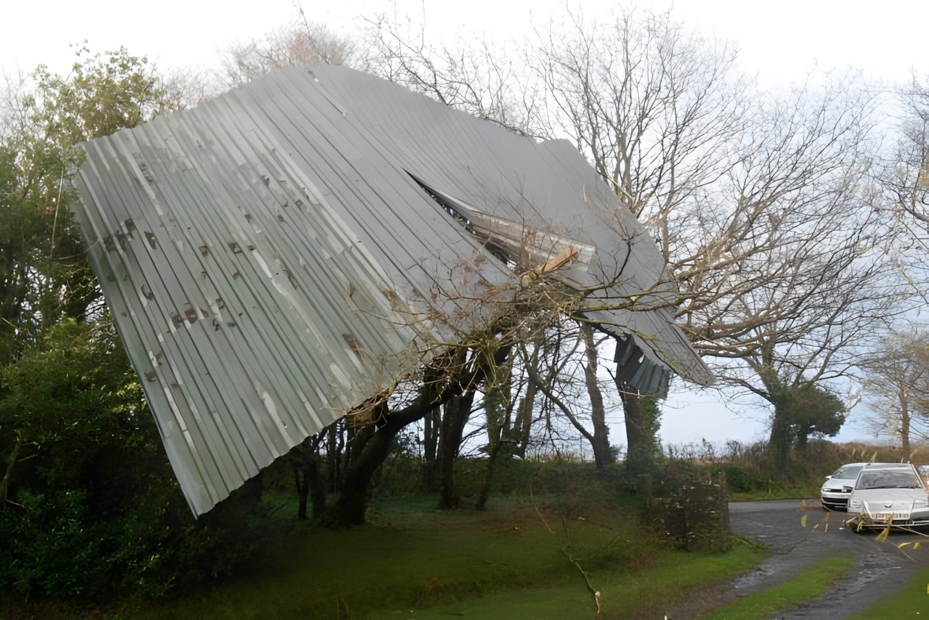 A call to our nearest neighbour put us fully in the picture. At the back of our boiler house and log store, just on the other side of the dividing bank, sits a big shed of the farmer next door. On the day we left for Somerset, Pembrokeshire experienced 90 miles an hour winds and one half of the roof of his shed was completely lifted off. Now, those of you that have a clear view in their head of what our entrance looks like know that our buildings are quite big and high next to the gate and are surrounded by mature trees. Somehow, this enormous piece of roof (which, apparently, was not properly strapped down when they replaced it about two years ago) got lifted so high that it cleared the boiler house – including its chimney – the roof of the log store as well as the trees, to eventually land at the top of an oak on the other side of our drive! That no buildings were damaged and no persons were hurt is a miracle.