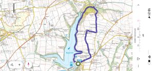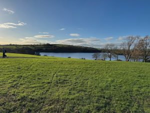 We plotted our own circular walk, using my OS Map app. This, by the way, is a very useful app to have on your phone as it saves having to lug around unwieldy maps and it gives you the option to map your route, it shows your exact position while walking, gives you a birds-eye view should you wish to, and much more. We took the eastern path along the reservoir before turning inland for our return leg. The trees along the path showed off their wonderful autumn colours against a blue sky and the sparkling water in the reservoir. We climbed a lovely bit of woodland to reach a small road. After that, we moved inland again over a bridle path, the first bit finding foothold through streaming water. Via Velindre’s farmyard (having established once again that the Pembrokeshire farming families know each other) and through a few fields we reached the road to Llys-y-Fran again just past Glebe Farm. Large stretches of the way gave us a view of the reservoir. Having had some torrential rain the week preceding some parts were quite wet and muddy, but nothing a good pair of boots and a walking stick could not handle.